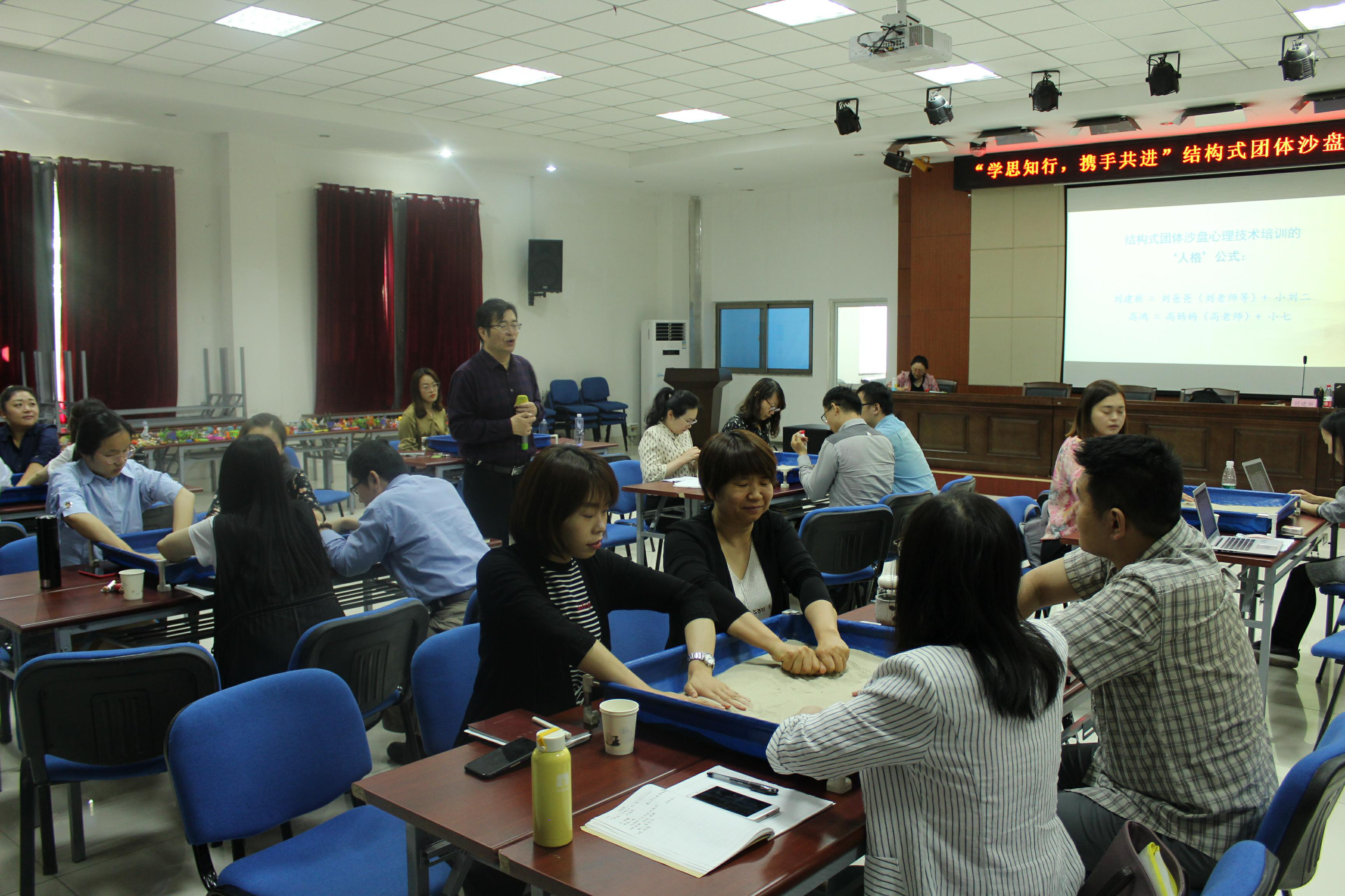 本次培训采用理论知识讲授与团体沙盘体验相结合的方式展开培训。首先刘建新教授引用鲜活生动的案例向大家阐述了结构式团体沙盘心理技术发展的‘人格’公式,以及在个人成长和人际沟通中的重要性和应用,其次在愉悦的学习氛围中通过破冰、分组及结构式团体沙盘心理技术体验操作引导各位老师密切结合人格公式初步体验沙盘心理技术,在沙盘情境中建立团队安全感,并进一步感受理解和掌握“尊重、陪伴、倾听、欣赏、关爱”的基本人际交往的态度,之后刘教授通过组内交流及组间解说、分享的形式带领大家亲身体验结构式团体沙盘心理技术中同伴督导的重要作用,最后让大家以“戴高帽”的方式积极探索和学习团队成员身上的优秀品质结束了一天的培训。