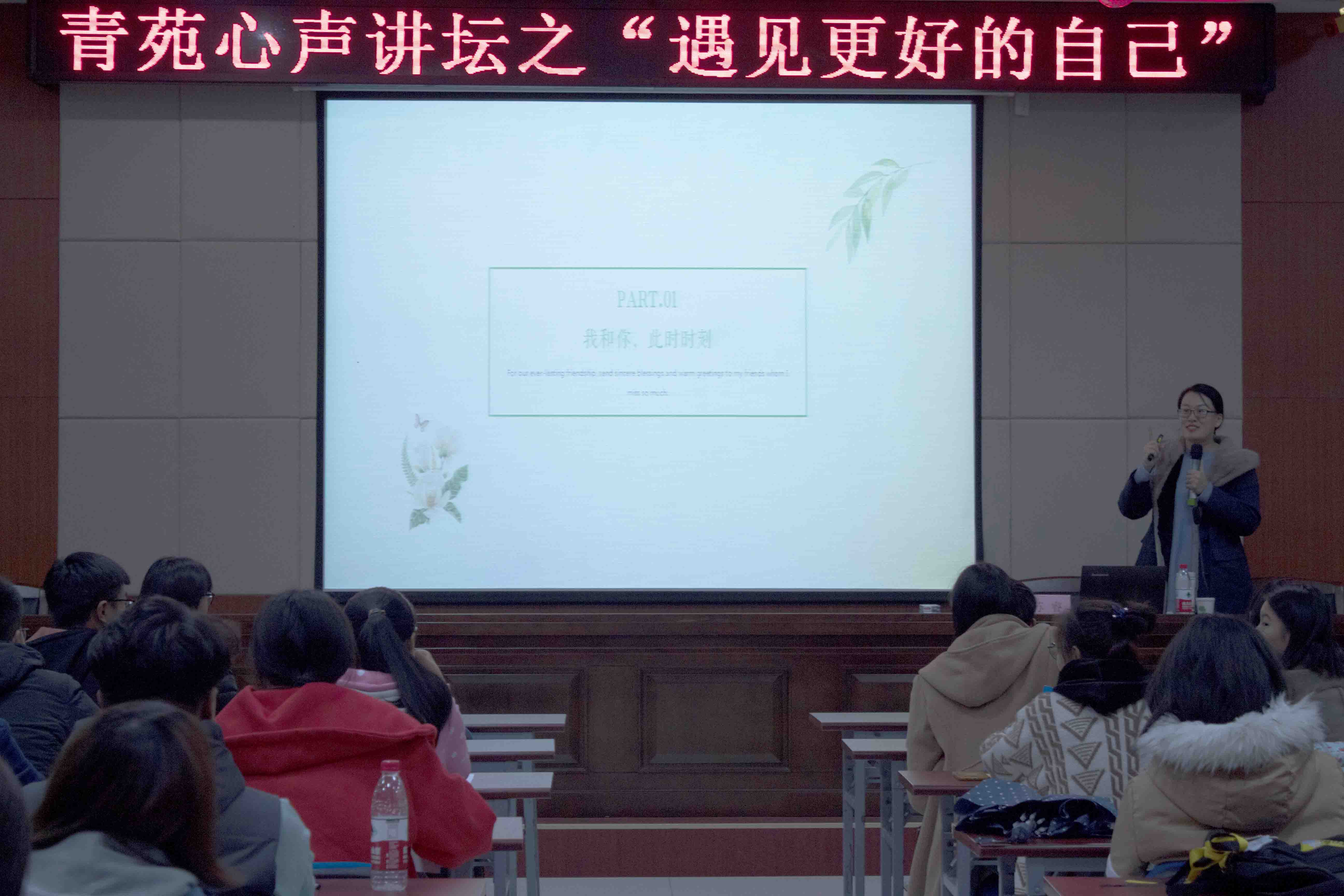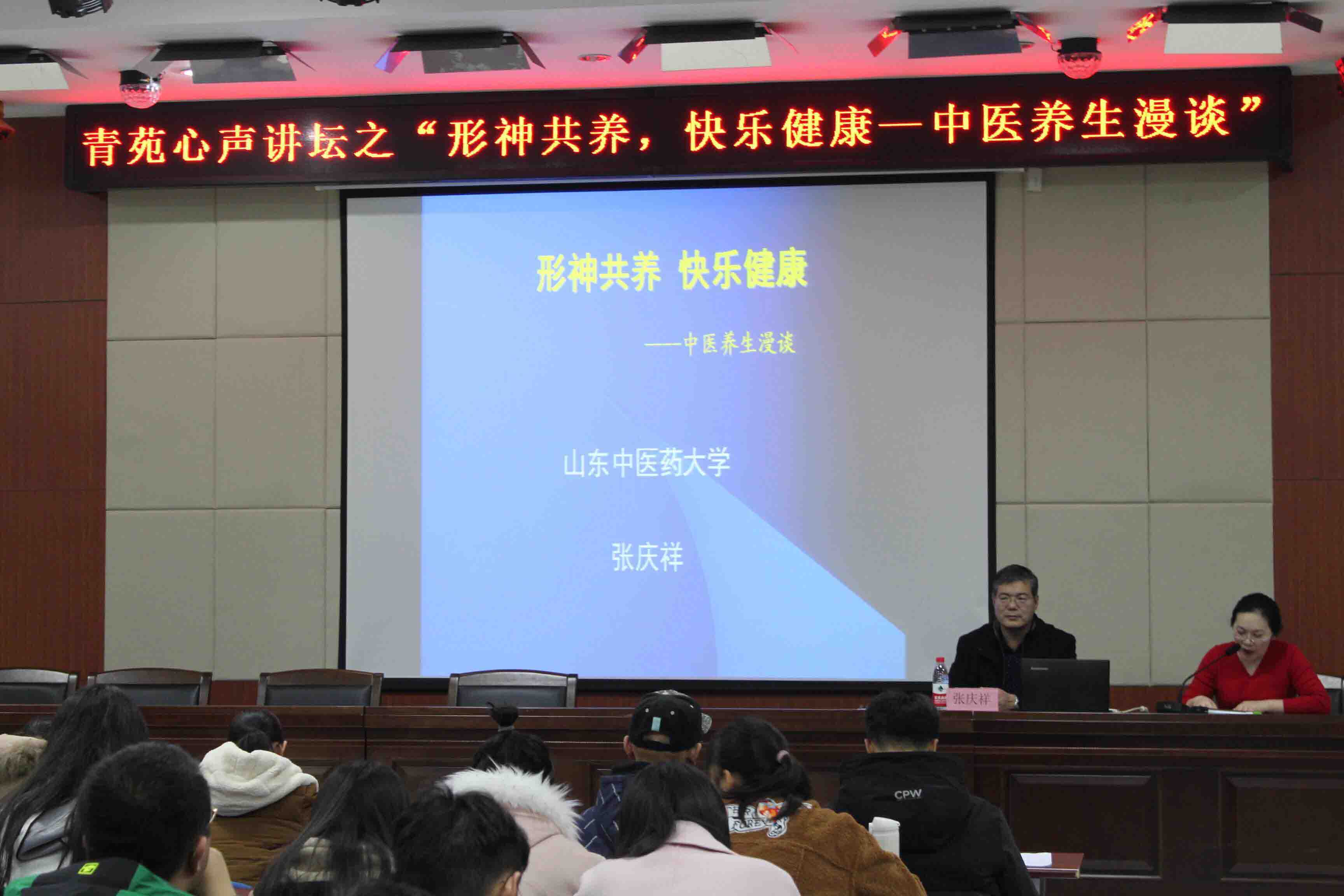 针对大学生群体普遍存在和关心的人际交往、恋爱情感、挫折应对和压力调节等问题,心理咨询中心于2018年年初精心打造了“青苑心声”讲坛。讲坛每月一期,邀请知名专家、学者讲授心理健康知识。本学期,已陆续邀请齐鲁师范学院苗军芙教授、心理健康教育与咨询中心苏睿主任,山东中医药大学博士生导师张庆祥教授分别做客讲坛。讲坛围绕“关注心理健康,享受绚丽的大学生活’‘遇见更好的自己”“形神共养,快乐健康——中医养生漫谈”帮助同学们进一步了解自己,引导同学们对自我进行积极探索,为引导广大同学度过美好的大学生活提供了行之有效的方法及建议,帮助他们收获更加美好健康的自己。