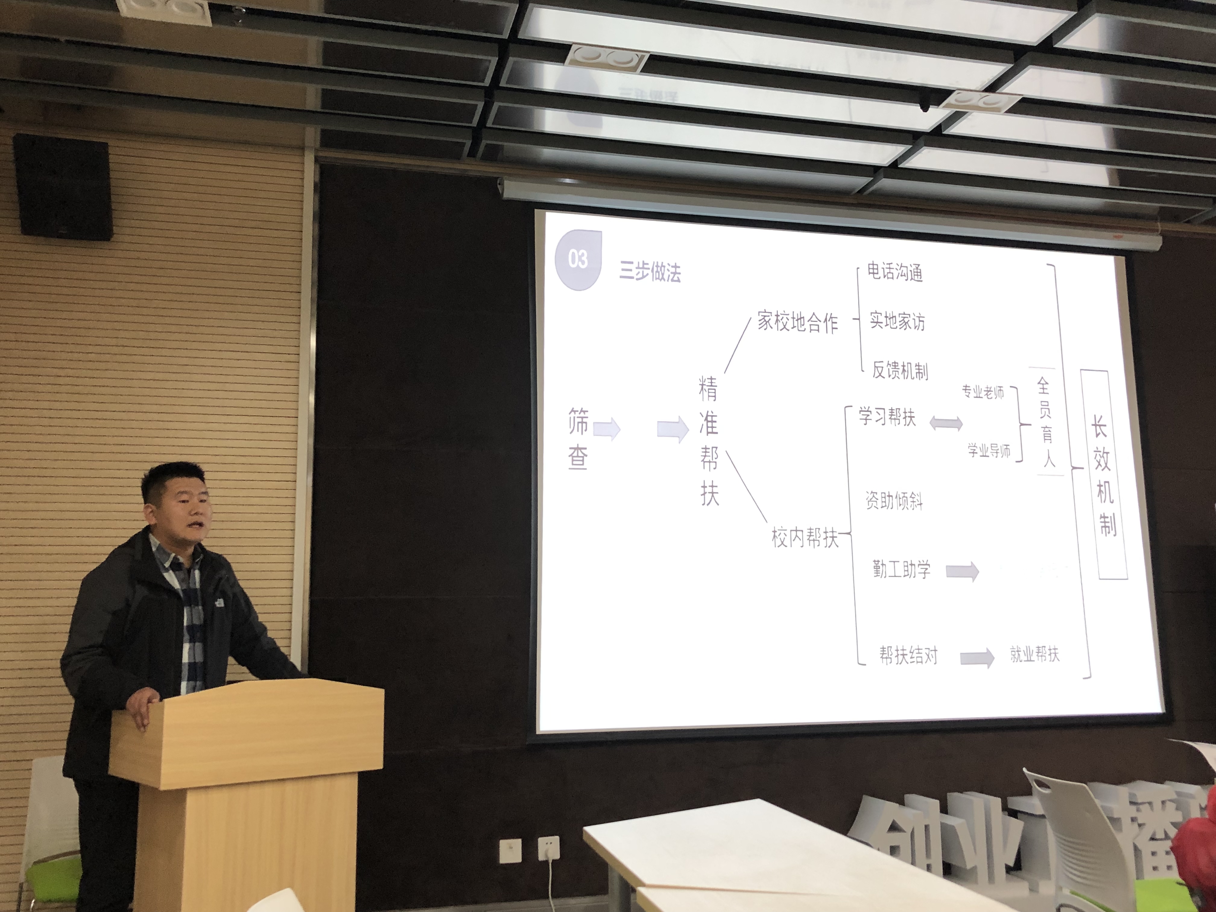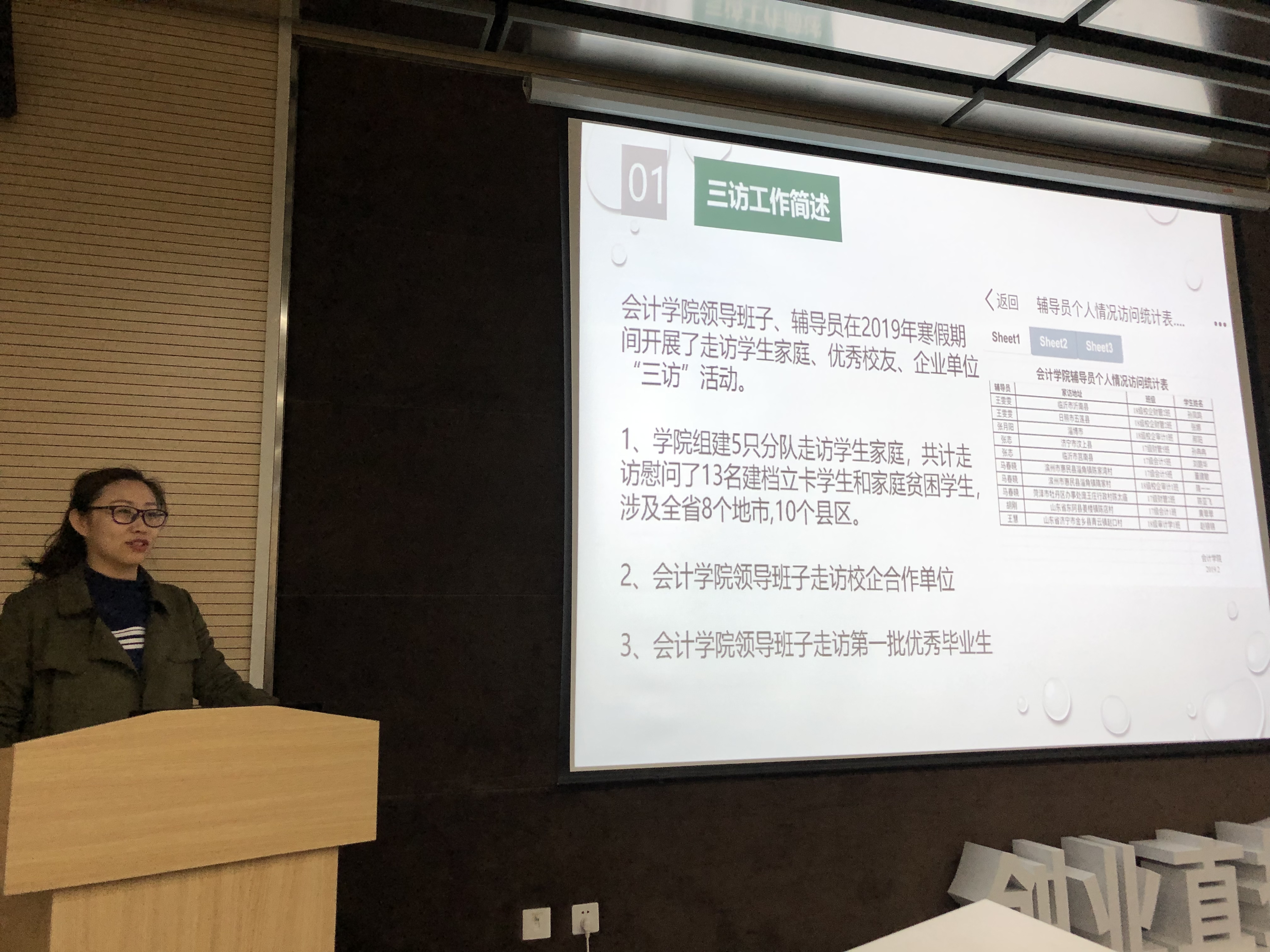 会上,各学院分别从工作开展方式、思路以及在走访过程中发现的实际问题出发,就“三访”工作进行了总结交流。汇报案例真实生动、有说服力,引人深思。与会辅导员就“三访”工作中发现的问题以及解决方法进行了热烈讨论。“三访”工作旨在通过深入、持续地走访家庭经济困难的特殊学生家庭、拜访优秀校友、访问用人企业单位等活动,进一步关心关爱学生、教育激励学生、服务成就学生,努力构建学校、家庭和社会教育紧密结合的“三位一体”的大学生思想政治教育模式,从而提高大学生资助教育、思想政治教育、创业就业教育的针对性和实效性。近几年来,我校深入贯彻“以学生为中心”的理念,将“三访”工作作为思想政治教育和资助育人的重要抓手,理顺体制机制、完善工作载体,不断扩大党政领导、专业教师的介入参与度和学生的覆盖面,赢得了学生、家长和社会的各方赞誉,取得了明显成效。
