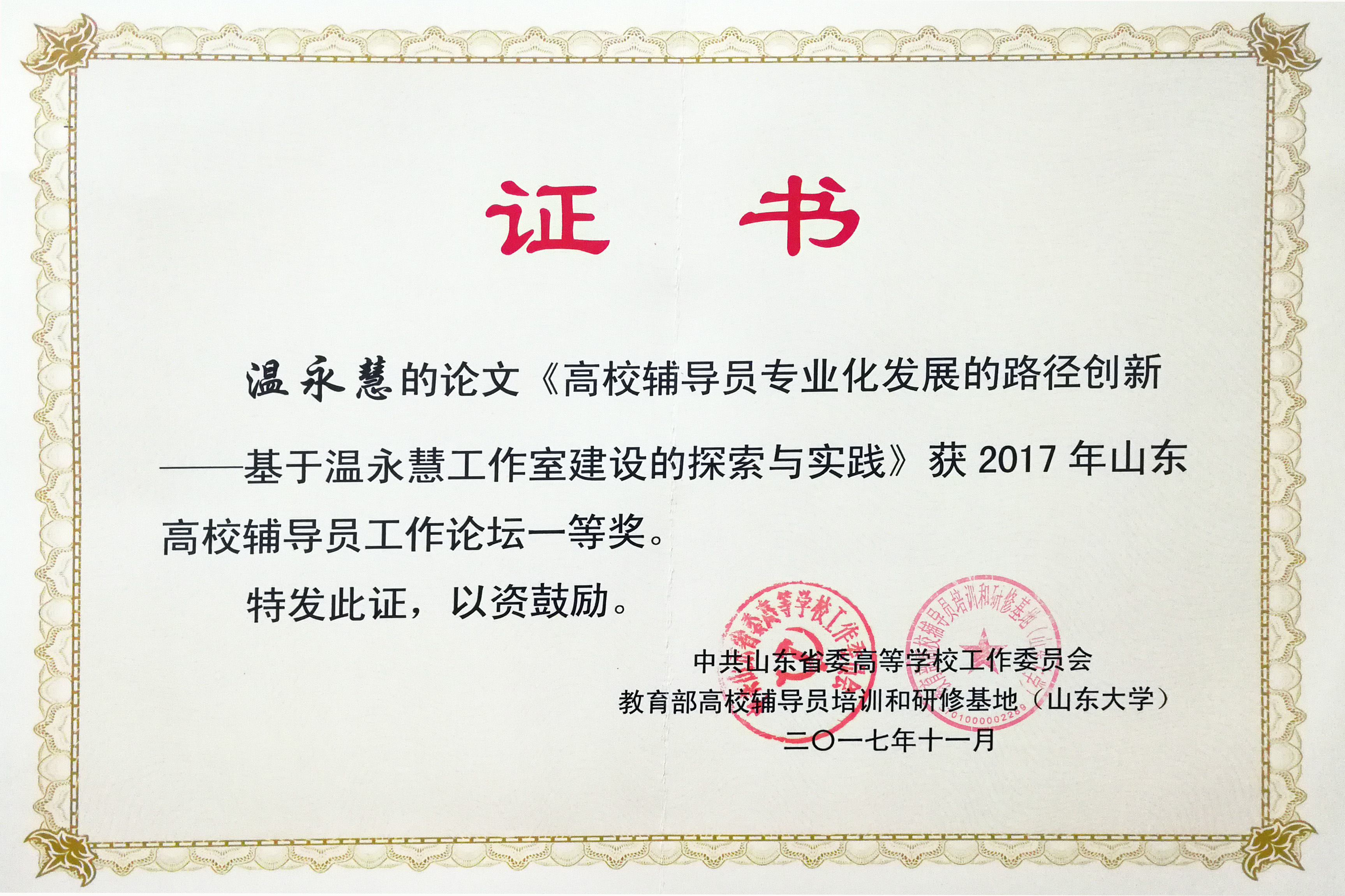 本次论坛以“围绕学生、关爱学生、服务学生,提高育人能力”为主题,共收到89所高校报送的论文256篇,经专家认真评审,共评出优秀论文98篇,其中一等奖20篇,二等奖33篇,三等奖45篇。温永慧的论文《高校辅导员专业化发展的路径创新——基于温永慧工作室建设的探索与实践》获得一等奖。