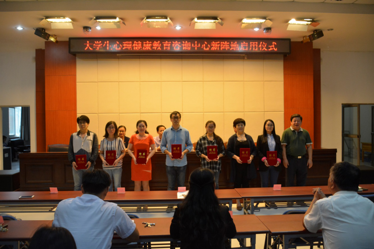 仪式上,刘校长为大学生心理健康教育咨询中心新阵地揭牌,学生工作处处长雷文庆向中心受聘的专兼职心理咨询教师颁发聘书。大学生心理健康教育咨询中心李洁详细介绍了中心新增的功能室及相关心理健康服务系统。
