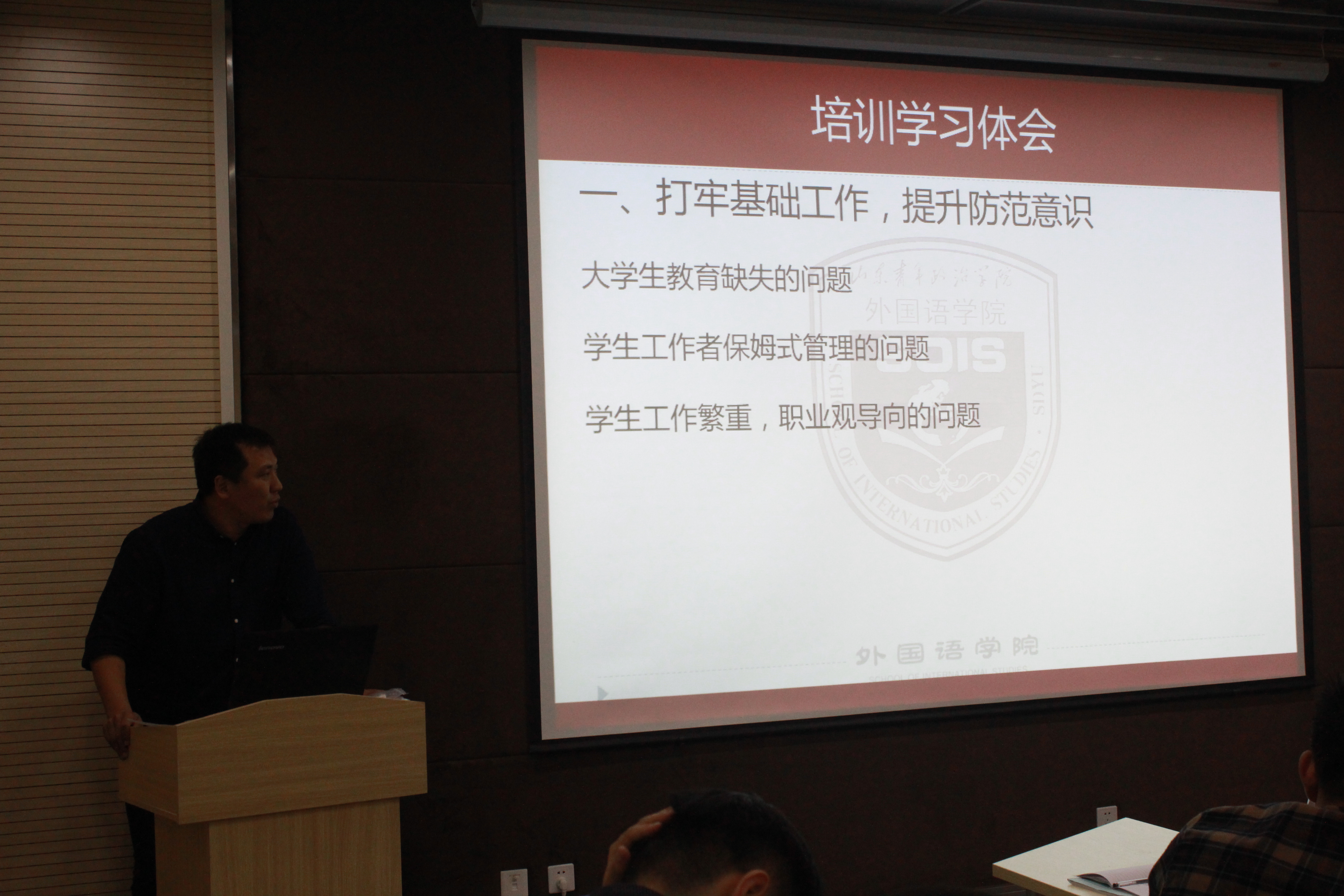 活动中,旅游学院党总支副书记韩相伟、外国语学院党总支副书记衣海永、舞蹈学院党总支副书记温永慧就外出培训学习的所见所闻所感进行了交流分享。韩相伟赴成都参加了高等学校安全教育管理研讨会,他从近年来高校安全工作的现状谈起,结合实际工作和大家交流了墨菲定律、海恩法则等与学校安全管理相关的理论,指出心理健康教育、法律知识教育、安全知识教育、校规校纪教育、网络安全教育是我们学校安全教育应抓的主要工作。衣海永赴桂林参加了高校危机管理与危机公关实务培训班,他对这次培训的内容作了简单介绍,结合培训和实际工作谈了自己的体会,他认为,应对危机,学生工作者一要打牢基础工作,提升防范意识,二要加强业务学习,提升管理效能。温永慧赴山东大学观摩学习了第一批山东高校辅导员名师工作室主持人终期考核,并参加了高校工委组织的第一期山东高校辅导员工作沙龙。她以“扎根‘向下’方能向上‘生长’”为题,向大家介绍了第一批山东高校辅导员名师工作室主持人终期考核的情况,谈了自己的体会和感受,为我校学生工作和温永慧工作室下一步的工作提出了宝贵的意见和建议。三位主讲人的分享,给了在场辅导员们很多工作上的思考和启发,大家都表示受益匪浅。
