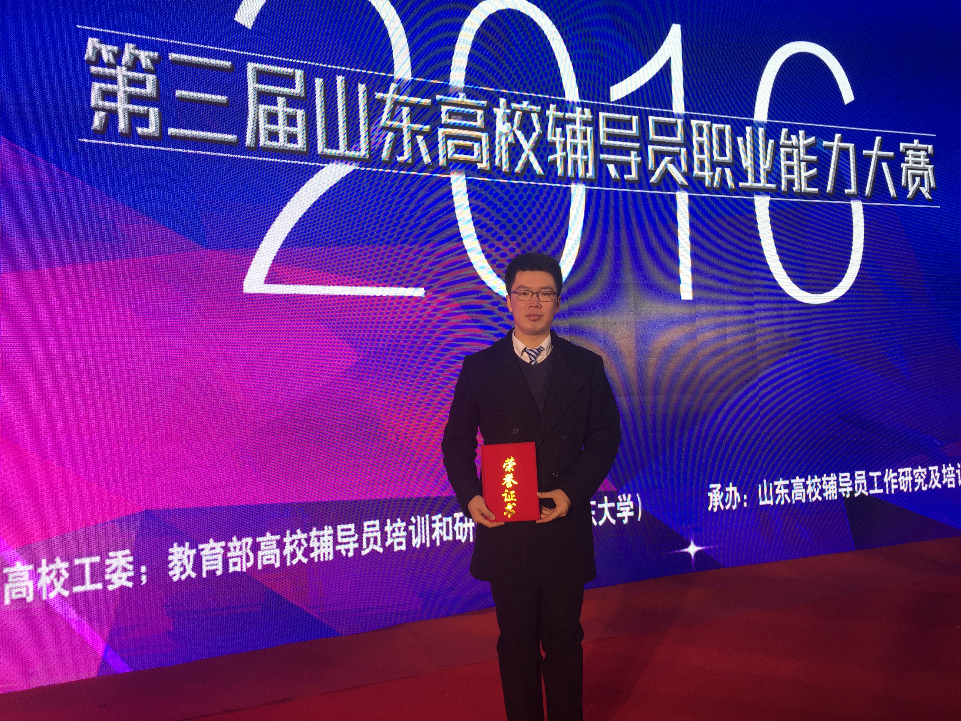 2016年12月3日至5日,******山东省委高校工委、教育厅高校辅导员培训和研修基地(山东大学)主办,山东高校辅导员工作研究及培训基地(山东建筑大学)承办的第三届山东高校辅导员职业能力大赛暨专题培训在济南举行。来自全省高校的126名辅导员参加了比赛,最终评出一等奖10名,二等奖20名,三等奖34名。我校会计学院辅导员刘研代表学校参赛并荣获三等奖。