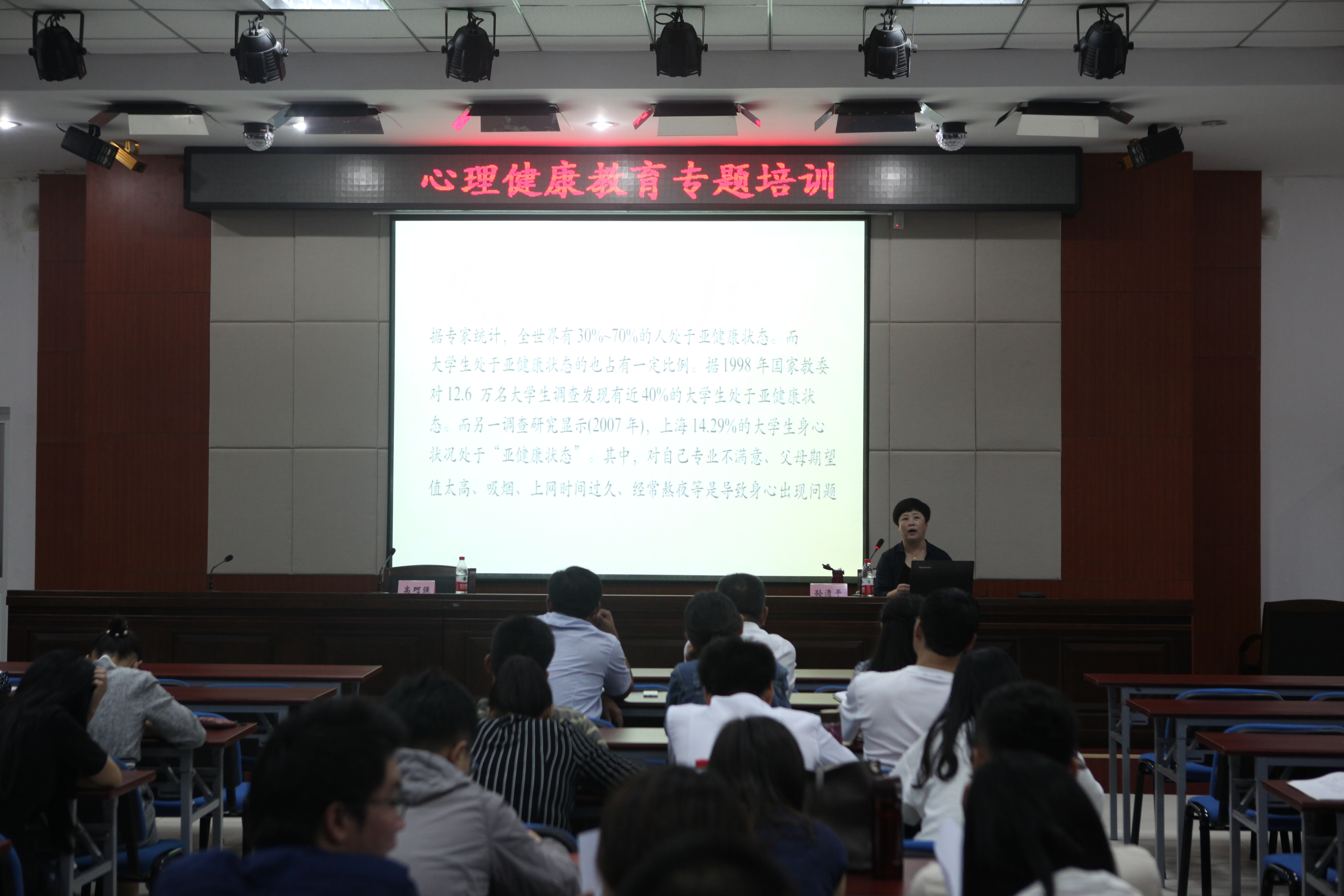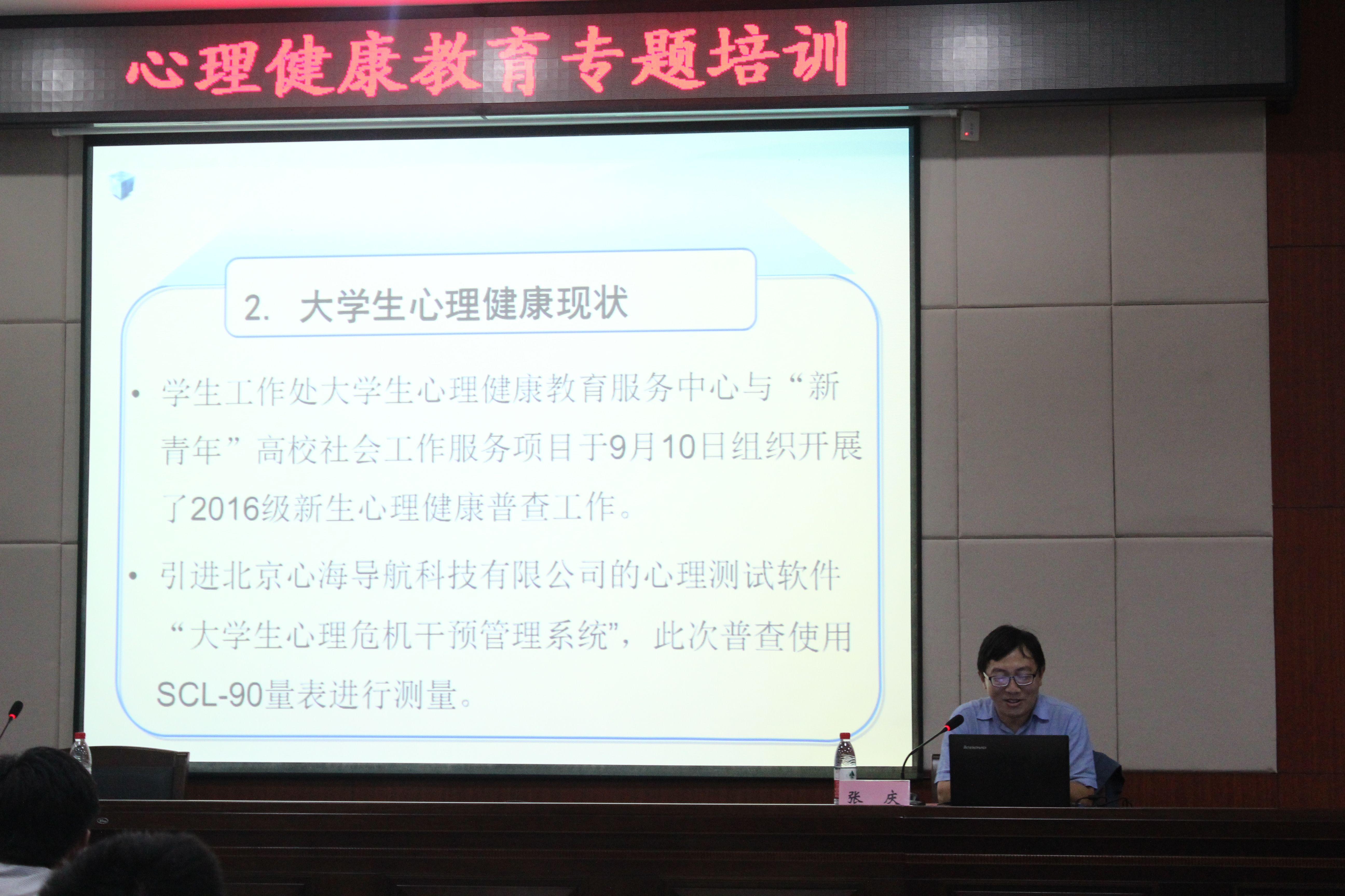 为进一步提高大学生心理健康教育服务工作的针对性和实效性,切实提高学生工作人员心理健康教育服务工作的能力和水平,结合2016级新生心理健康普测工作情况,按照2016年辅导员培训计划,我校分别于9月27、29日下午举行了两场心理健康教育专题培训,心理学教研室主任孙清平教授、张庆博士分别做了题为《心理健康教育的意义与原则》《大学生常见心理困惑识别和矫正》的专题培训。各学院党总支副书记、专兼职辅导员、2016级新生班主任参加了培训。