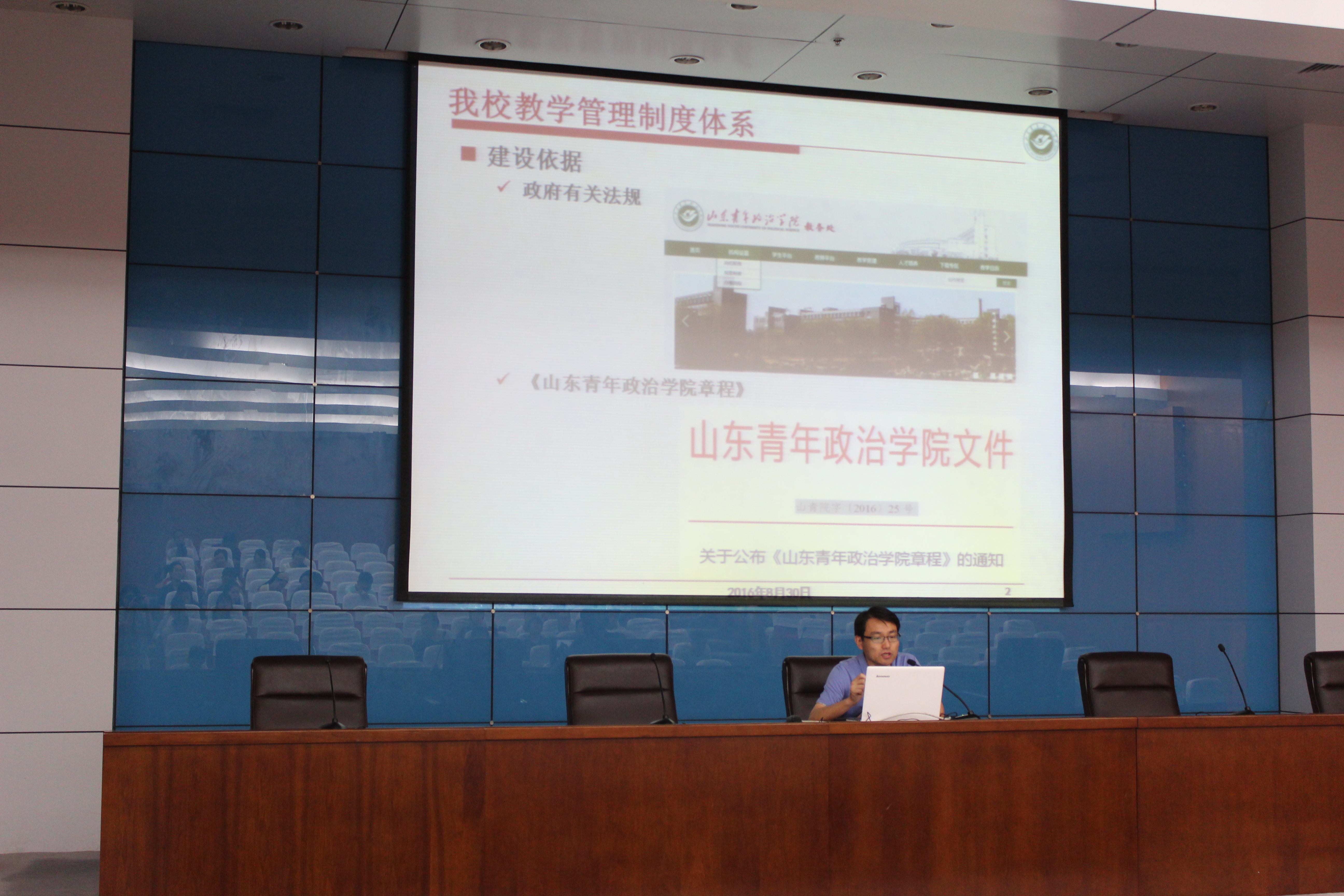 培训共分四个专题,分别为教学管理、就业创业指导、新生教育和经验交流。教务处副处长李亚光以全面学分制下的教学管理制度为题,从人才培养目标到各专业人才培养方案,从我校教学制度体系到各项具体制度和管理办法进行了一一讲解。招生就业处副处长夏继周就职业生涯规划、就业创业指导对大家进行培训,并结合自身的经验和体会给新生班主任工作提出建议。学生工作处副处长高珂强以新生教育及学生管理制度为主题,讲述了95后大学生的特点及新生教育的重要性,要求大家熟知各项学生管理制度,对新生做好教育和引导。 随后,山东省高校十佳辅导员、信息工程学院辅导员张婷婷就成功召开第一次班会的经验和做法与大家做了分享,我校优秀班主任、会计学院教师赵玉婷以“播撒爱的种子,收获爱的幸福”为题就班主任工作方法与大家进行了交流。