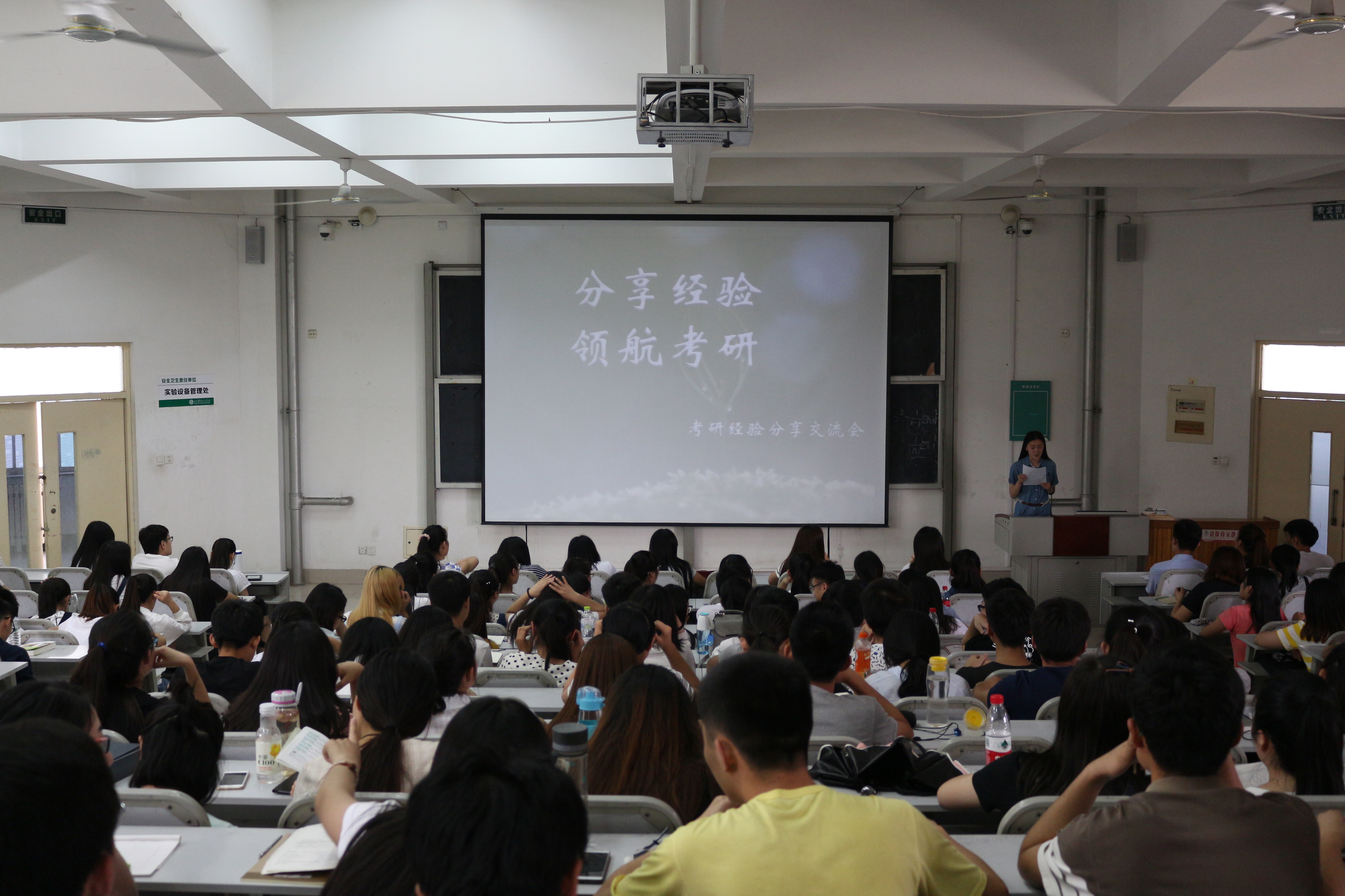 考研分享交流会以“分享经验 领航考研”为主题,共举办两场,第一场由我校在2016年研究生考试中取得优异成绩的学生代表分享了他们考研历程,并就备考过程中应当注意的“如何择校”“如何合理地安排复习时间”“如何掌握适合的复习方法”“如何‘做真题’”、考研心态调节等问题与在场同学进行了交流分享,为同学们答疑解惑、指点迷津。第二场邀请到著名考研辅导专家、高联政治教研室负责人王蕾迪做专场指导讲座,王老师对当前考研形势和比较容易考研成功的985、211高校进行了深刻地剖析,对考研各阶段的安排以及各门课程的学习方法、技巧进行了深入地指导。他希望同学们做好自身定位,确立适当目标,做好考研准备。