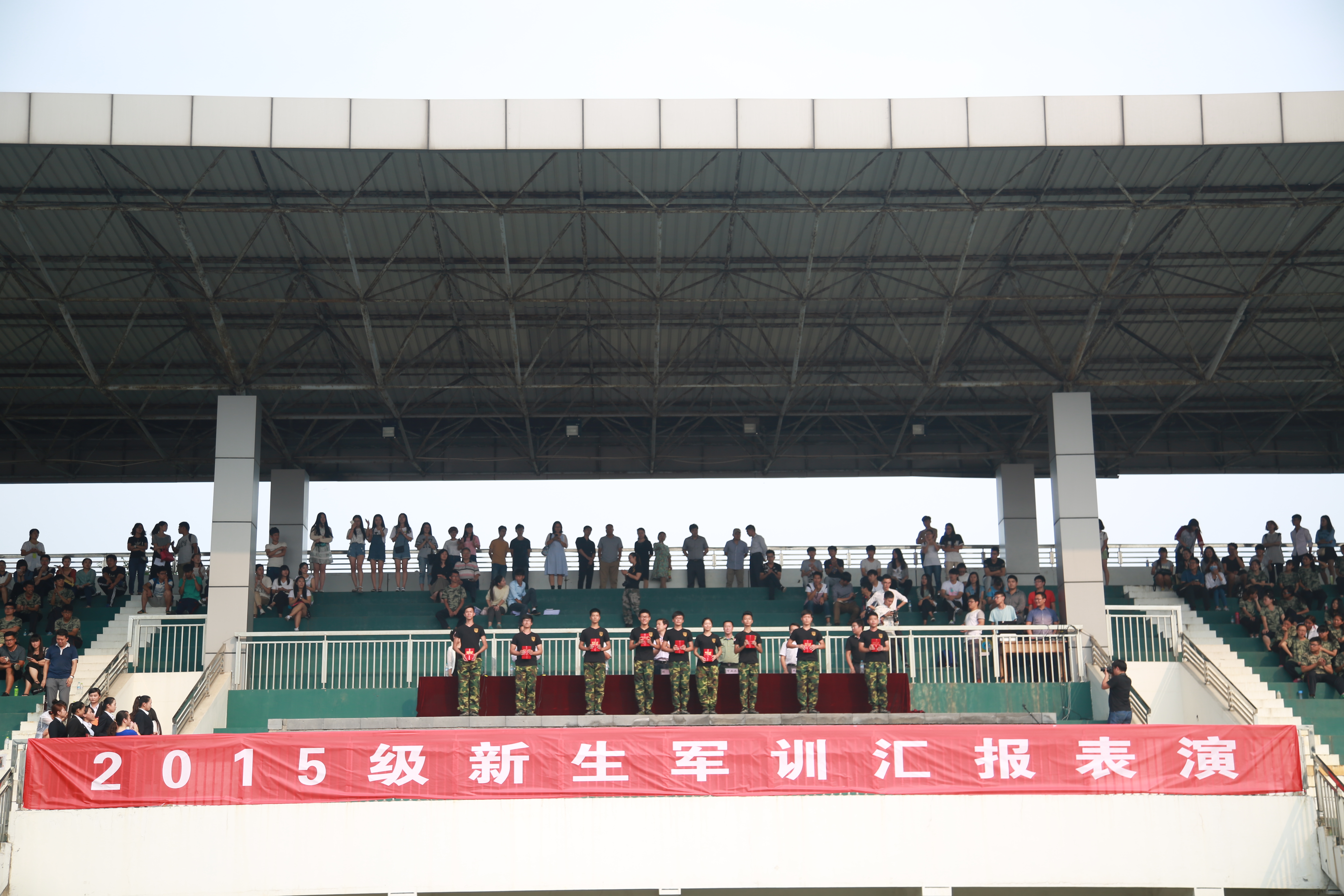 在威严、庄重的国歌声中,2015级新生军训汇报表演拉开序幕。由各军训连参训学员组成的汇报表演方阵在教官统一指挥下,以良好的精神风貌向与会的领导老师展示训练成果。此次汇报演出,形式新颖多样,军训队列表演、拉歌对唱赛、手语操、军体拳、捕俘拳等一一呈现,新生们在会演中,口号嘹亮坚定、精神积极向上,充分展示了自强不息、勇于争先、报效祖国的强烈心声,他们的良好表现赢得了与会领导和现场观众的一致赞许和热烈掌声。随后校团委副书记蒋涛涛宣读了《关于表彰2015级新生军训先进集体和先进个人的决定》,与会领导和部队首长为获奖的先进集体和个人颁发了奖状和荣誉证书。