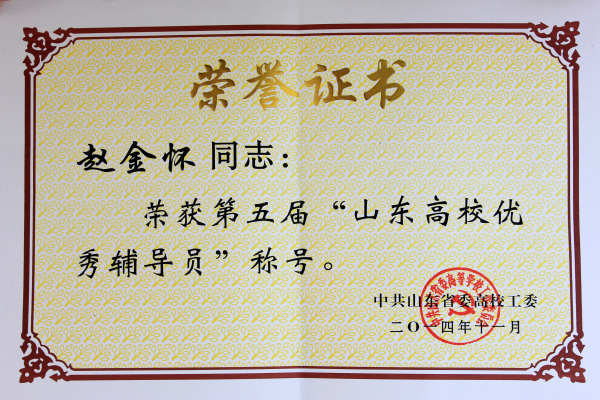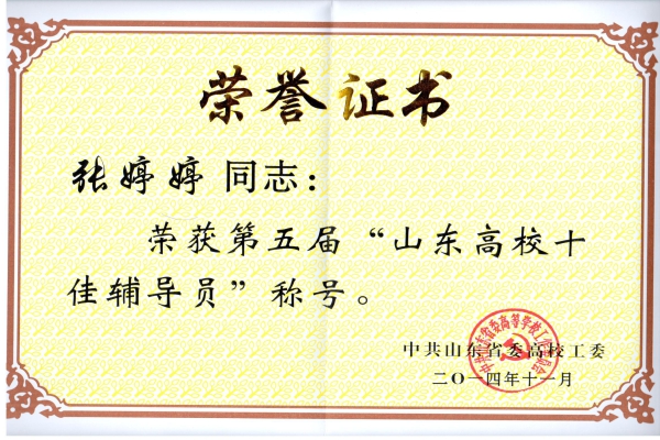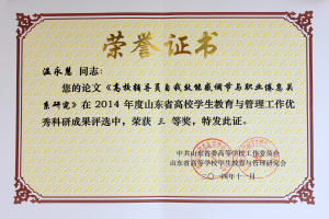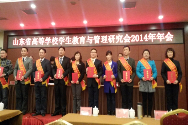 会上还对第五届“山东高校十佳辅导员”、“山东高校优秀辅导员”和2014年度全省高校学生教育与管理工作优秀科研成果和进行了表彰。我校信息工程学院辅导员张婷婷被评为第五届“山东高校十佳辅导员”,舞蹈学院辅导员赵金怀被评为第五届“山东高校优秀辅导员”;商学院党总支副书记石瑞宝提交的论文《大学生价值观形成的影响因素及其对策研究》荣获优秀科研成果一等奖,学生工作部(处)副部(处)长温永慧、旅游学院单铭磊提交的论文分别荣获优秀科研成果三等奖。