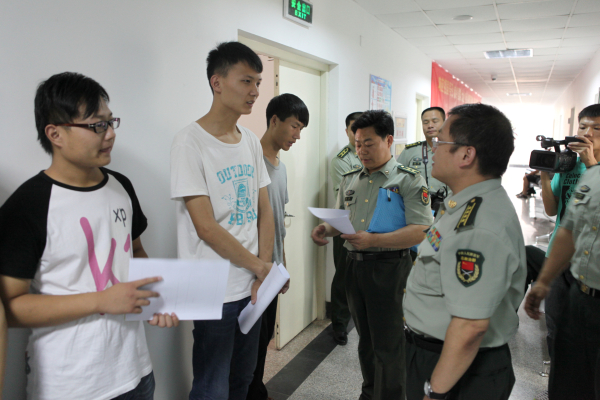 调研采访组首先在医疗服务中心对我校大学生预征初检情况进行了现场采访。在现场采访过程中,武装部部长雷文庆简要介绍了我校大学生预征报名情况,并介绍了我校大学生预征兵网上报名、网上审核、初审、初检的内容、标准、程序等。领导、记者在体检间隙和预征报名的学生进行了现场交流。部队领导对我校大学生预征的组织、宣传、初检等工作给予了充分肯定。