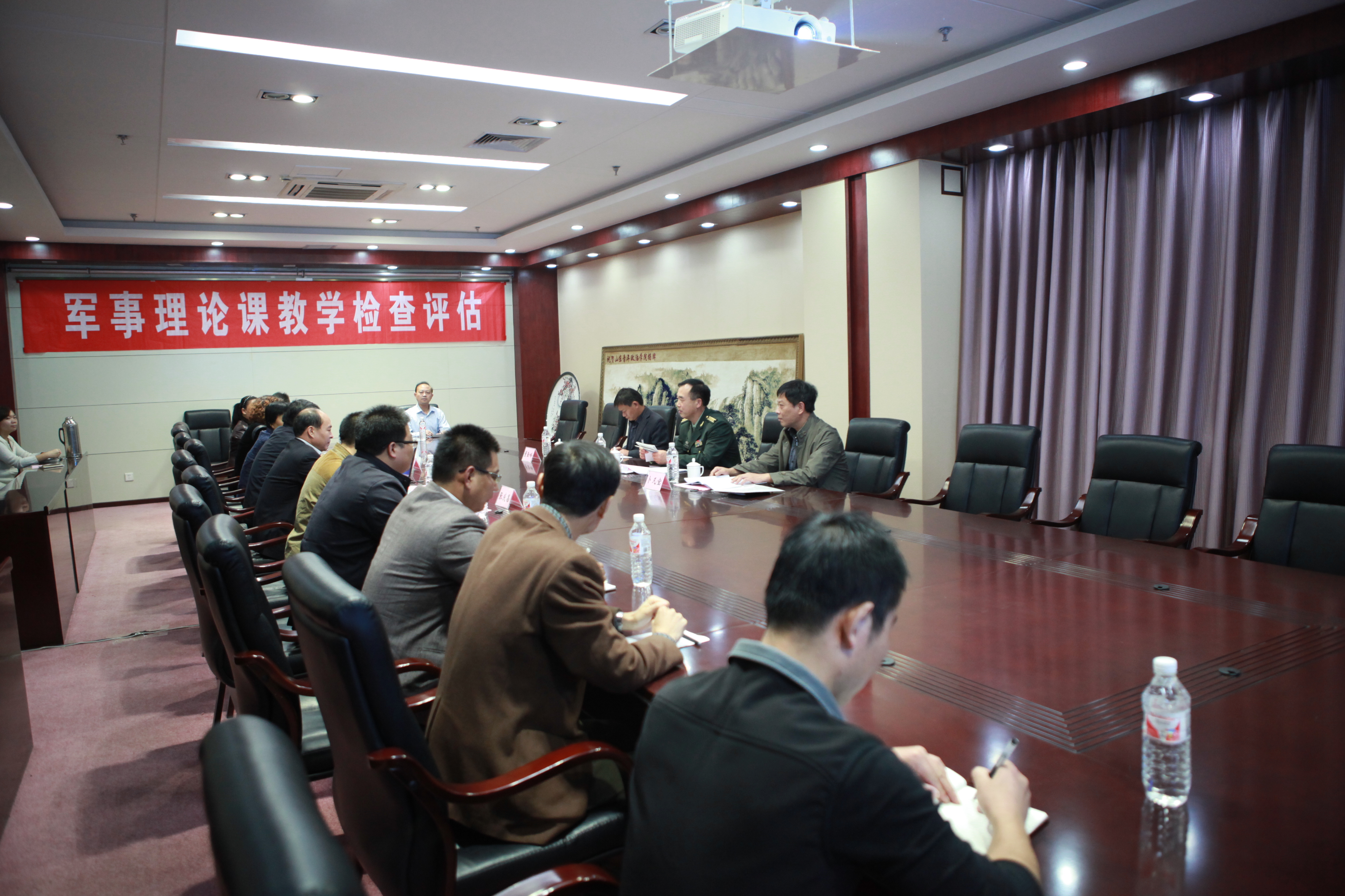 学校领导王林山首先代表学校全体师生员工对各位专家、领导莅临指导我校军事理论教学工作以及对我校国防教育工作的全面指导与大力支持表示衷心的感谢,并简要介绍了我校的基本情况。我校就军事理论教学工作向专家组进行了汇报。汇报人结合学校实际,从学校军事教学的基本概况、组织领导、教学管理、师资建设、教学保障以及学校军训、国防教育特色活动等方面进行了汇报。汇报结束后,专家组查阅了我校大量军事理论教学的相关档案材料,并召开师生座谈会,实地考察了我校教学基础设施。