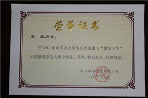 6月14—15日,山东省大学生心理健康教育专业委员会2012年年会在淄博职业技术大学召开,会议通报表彰了山东省2012年大学生心理健康节获奖作品,我校政治与社会发展学院选送的作品《蜕变》荣获山东高校心理情景剧短片DV大赛三等奖,工商管理学院李政同学荣获山东高校“微笑人生”大学生心理微博原创大赛三等奖。