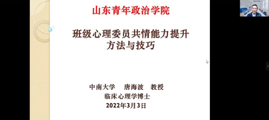为进一步加强和改进我校大学生心理健康教育工作,切实提升班级心理委员的共情与人际交往能力,3月3日,我校邀请中南大学心理健康教育与咨询专家唐海波教授开展了一场以“心理委员共情能力提高的方法与技巧”为主题的心理健康教育能力提升专题网络培训。讲座由学生工作部(处)大学生心理健康教育咨询中心副主任李洁主持,全校各班级心理委员参加培训。