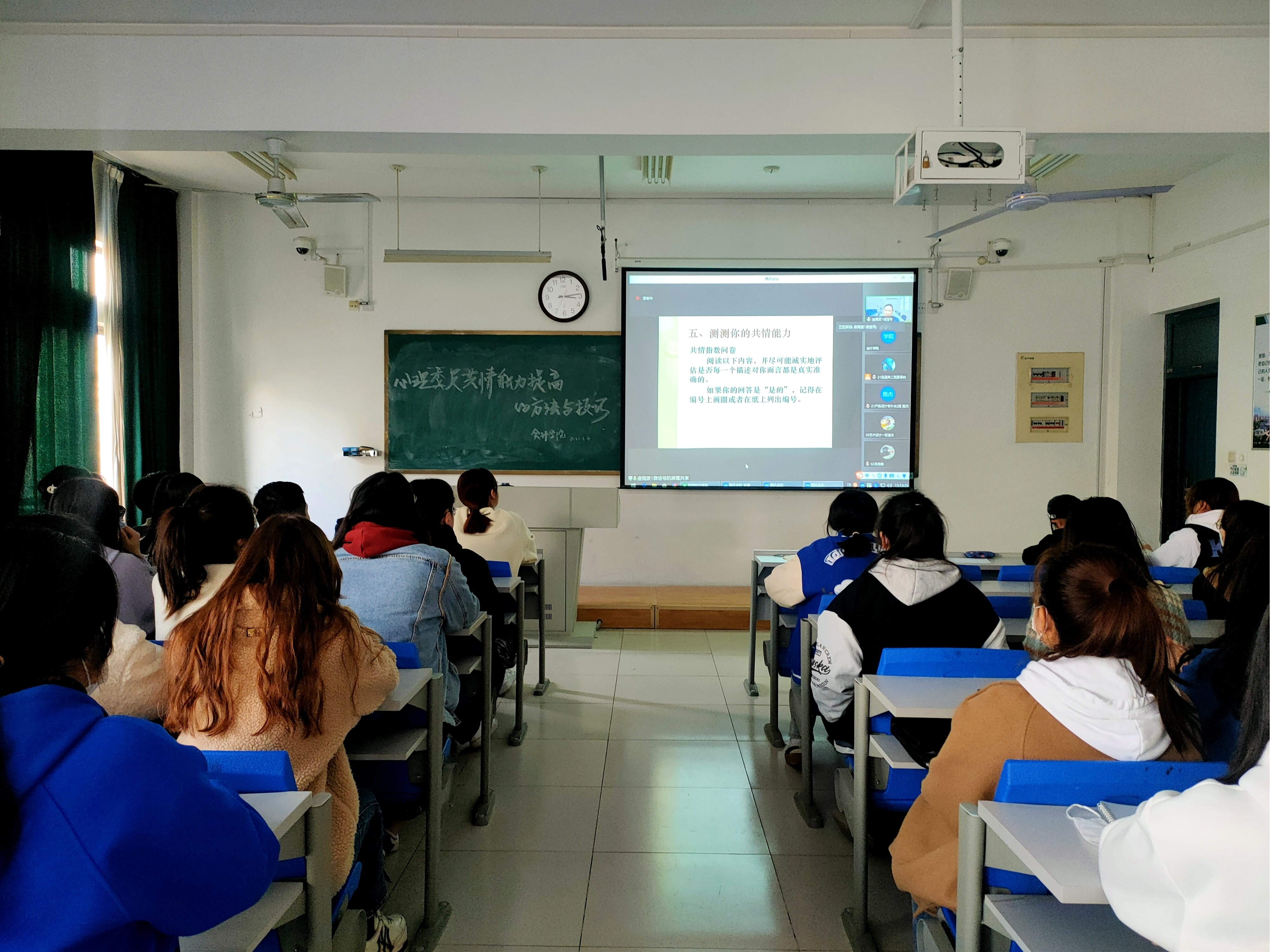 唐教授通过理论讲解、案例分析及心理测评等形式向大家阐述了共情的概念及发生过程、共情能力的训练方法和需要关注共情的学生类型。培训内容翔实,深入浅出,赢得了同学们的一致好评。会计学院孔烁同学说:“通过参加本次培训深刻体会到了共情能力对于班级心理委员的重要性,加深了对这一职位的认识,并努力将所学所感充分运用到今后工作中,做一名合格的心理委员,更好地为同学和班级做贡献。”