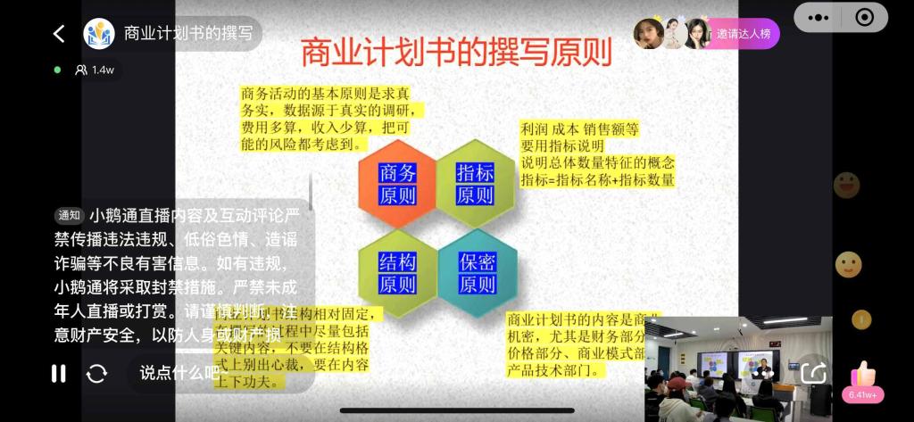 讲座以商业计划书的撰写为主题。赵新燕从我校的创新创业做法和取得的成绩向大家展示了我校对青年学子创新创业的高度重视,良好的创新创业氛围和学生们的创新创业激情。而后通过分享自身实战经验与典型商业案例,结合当今大学生就业创业难点、痛点,从学生个人的职业生涯规划出发,剖析就业和创业异同,针对商业计划书中执行摘要、项目描述、产品与服务、市场营销、团队管理、财务分析、风险分析等内容进行全面细致地讲解。讲座中,她鼓励大学生要尽早做好职业生涯规划,并就如何提升创新创业能力提出了建议。同学们纷纷表示,此次讲座为我们今后参加学科竞赛提供了清晰的思路和有力借鉴,为我们做好创新创业实践提供了宝贵的经验与实战技巧,让我们对未来有了更明晰的规划,我们将尽快把老师所讲授的内容用于学习和实践中,提高自身的创新创业能力,提升自身的就业竞争力。
