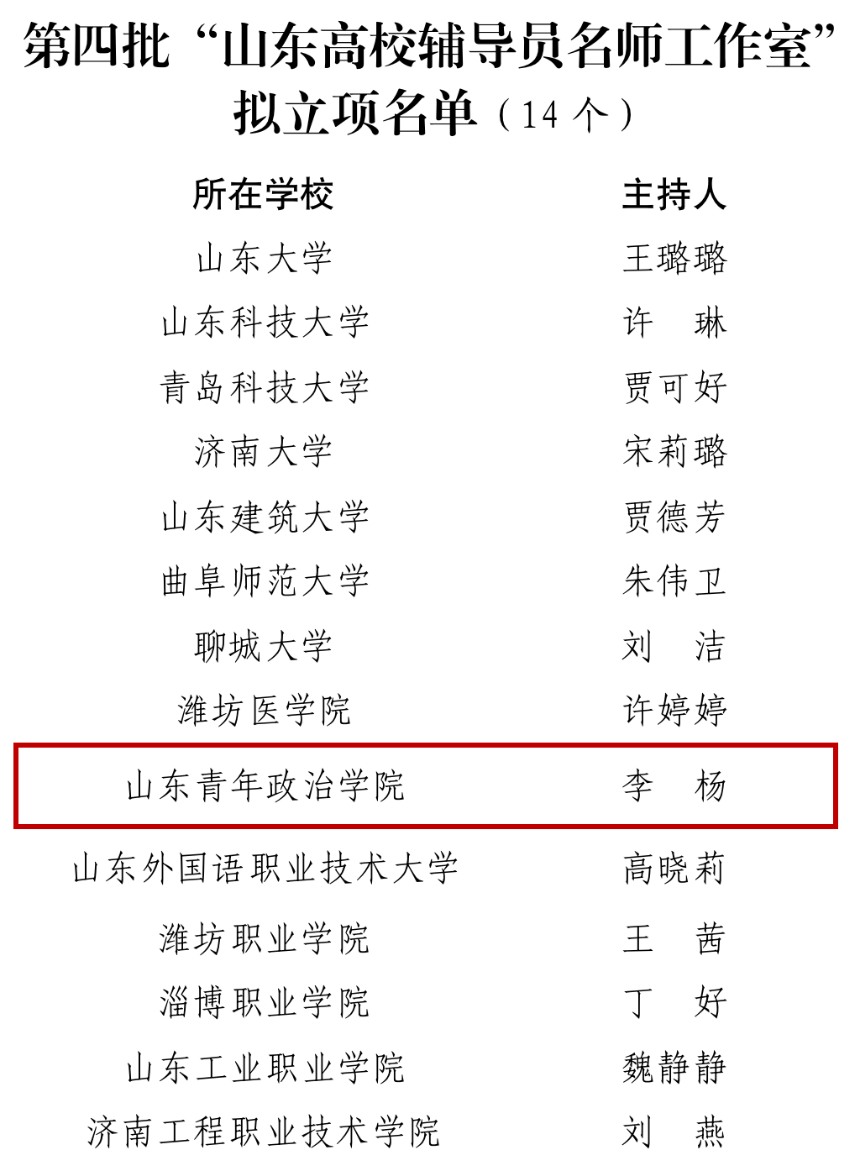 近日,山东省委教育工委、山东省教育厅公布第四批“山东高校辅导员名师工作室”立项名单,我校文化传播学院党委副书记李杨主持的辅导员名师工作室获批立项。