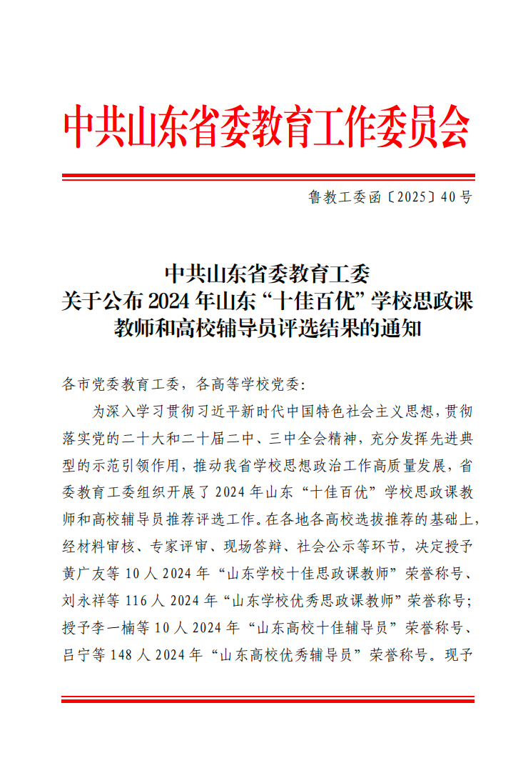 近日,中共山东省委教育工委公布了2024年度山东高校“十佳百优”辅导员评选结果,我校经济管理学院任正实、外国语学院王影影荣获“山东高校优秀辅导员”荣誉称号。