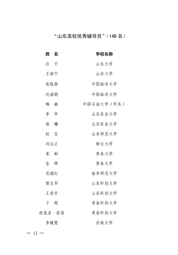 本次评选由中共山东省委教育工委组织开展。经过各高校推荐、材料审核、专家评审、现场答辩等环节,共评选出“山东高校十佳辅导员”10名,“山东高校优秀辅导员”148名。