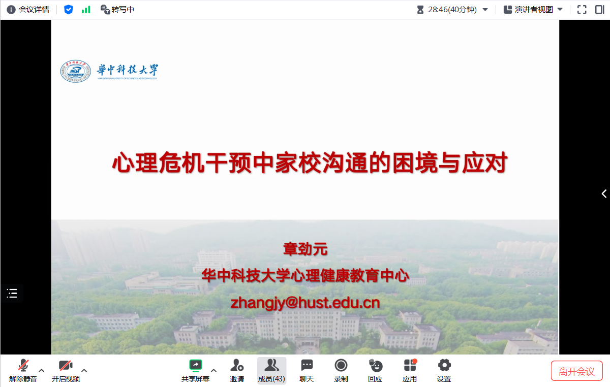 为进一步提升辅导员队伍心理健康教育工作的专业化水平,强化辅导员心理危机干预和家校沟通的能力,10月16日,学校举办辅导员心理健康教育工作技能提升专题网络培训。培训特邀华中科技大学心理健康教育中心主任章劲元作专题辅导。学校学生工作处相关同志及全体辅导员参加培训。