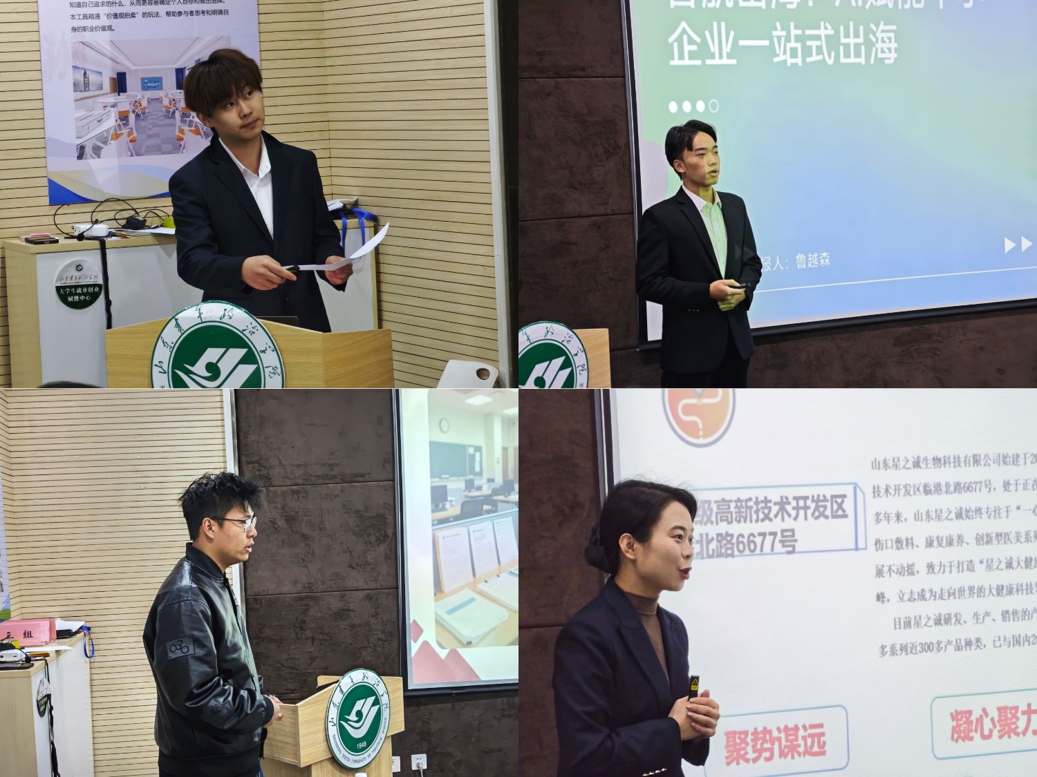 本次答辩活动邀请校外导师创谷(山东)教育产业发展有限公司总经理、山东省大学生创新创业教育指导委员会委员、项目孵化与创新成果转化专委会副组长王颖,稼轩人才集团创业园区负责人姬丽莹与校内导师王浩、李仁大、梁志刚、白玉6位创业导师对入驻项目进行现场评审。