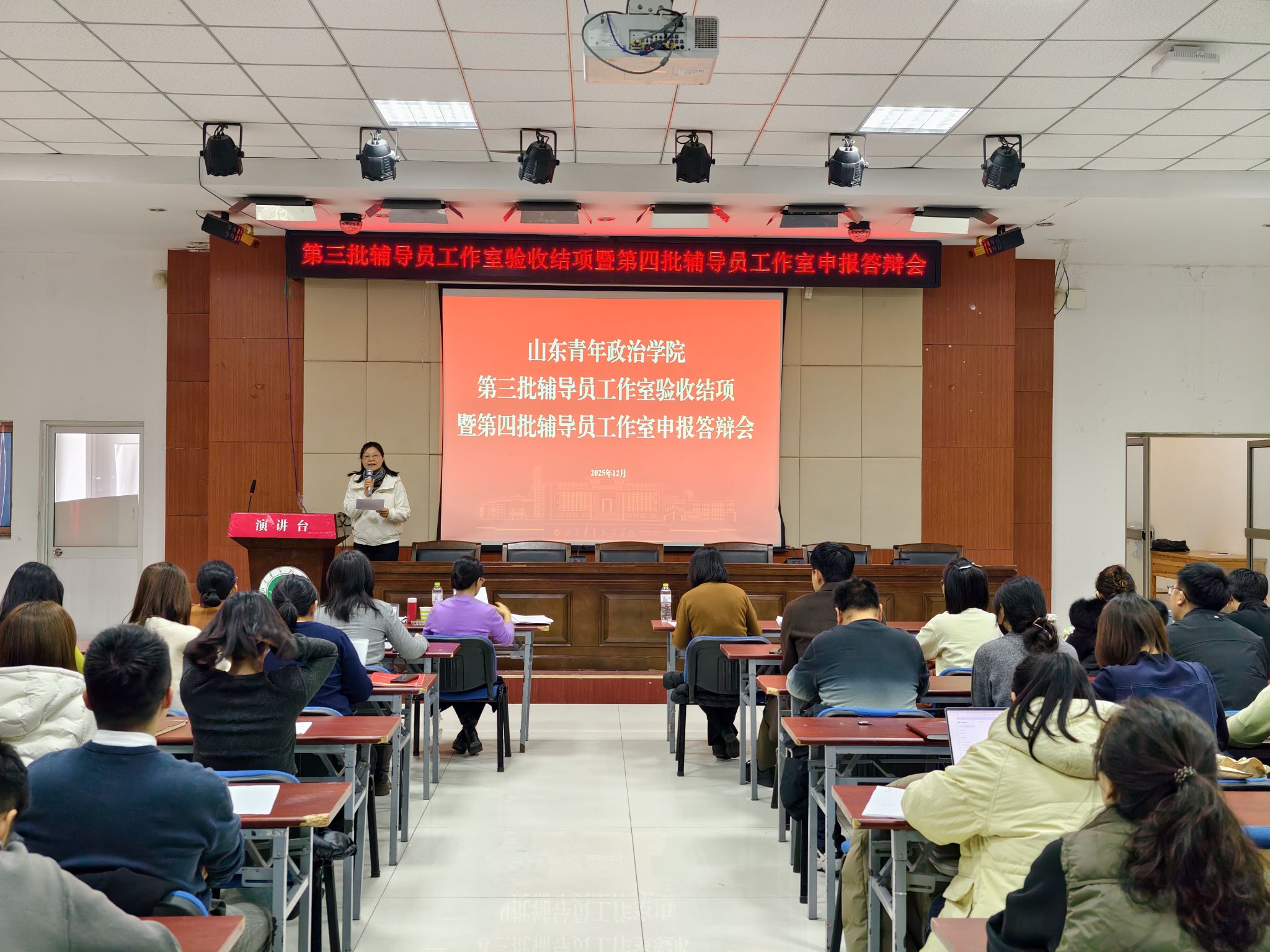 为进一步发挥辅导员工作室的育人优势,搭建辅导员成长发展的支持平台,促进新时期思想政治教育工作高质量发展,12月19日,学校举行第三批辅导员工作室验收评审暨第四批辅导员工作室申报答辩会。活动特邀山东省第四批高校辅导员名师工作室主持人刘燕、贾德芳担任评委。学校全体辅导员到场观摩学习。