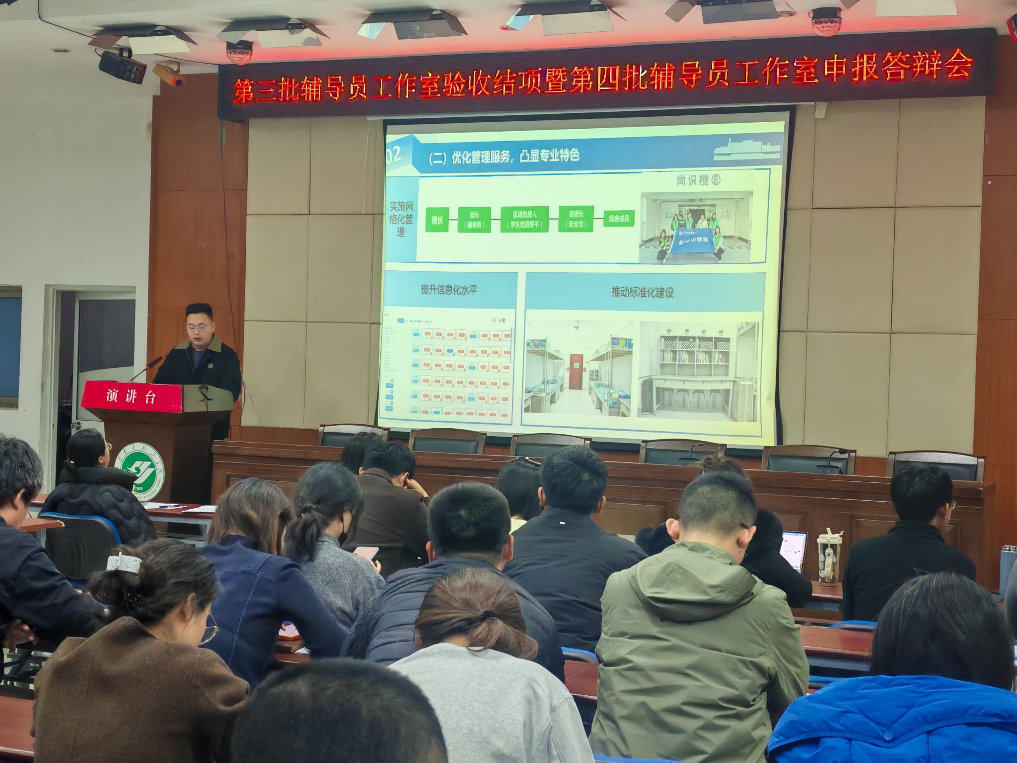 在结项验收环节,第三批辅导员工作室主持人逐一上台,围绕工作室建设情况、阶段性工作成果、存在的主要问题和下一步工作计划等方面展开阐述,系统展示了各个工作室鲜明的育人特色和扎实的育人举措。在立项评审环节,“红蕴青春π”“经纬职途”“E触即发”“青心筑基层”等拟建工作室主持人从建设背景、工作基础、建设目标、实施方案及预期成果等方面全面阐述了工作室的建设构想。评审专家对各个工作室的汇报给予了高度评价,并就辅导员工作室的定位精准性、特色凝练、成果转化路径及可持续发展能力等关键问题进行了深入解析与精准点评,为辅导员工作室建设指明了方向。