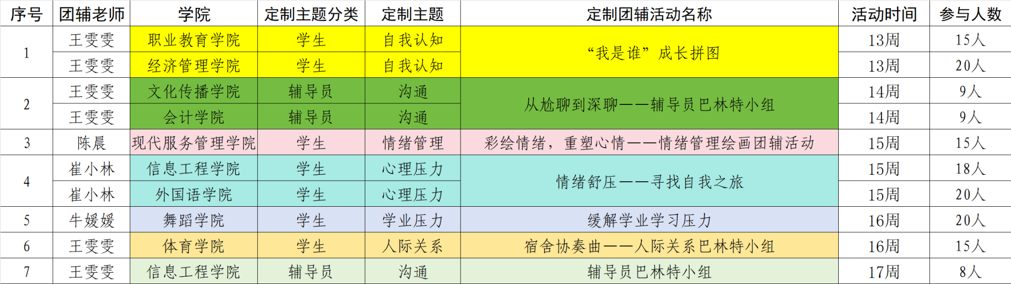 活动聚焦自我认知、情绪管理、压力纾解、生命教育、人际关系等五大核心主题,面向学生群体,根据学院特色与师生需求,分不同主题开展团辅活动,共吸引了149名师生的积极参与。经济管理学院、职业教育学院新生通过“我是谁”成长拼图、OH卡牌体验等梳理自我特质,现代服务管理学院以彩绘形式学习并掌握情绪管理的科学方法,信息工程学院、外国语学院借“生命之树”创作探索生命意义,体育学院依托巴林特小组优化人际关系等。此外,大学生心理健康教育中心还面向全体辅导员定制专属巴林特小组活动,使辅导员在集体交流中拓宽工作视野、缓解工作压力、获得情感支持,掌握实用的心理帮扶举措,为心理育人工作提供了新思路、新方法。