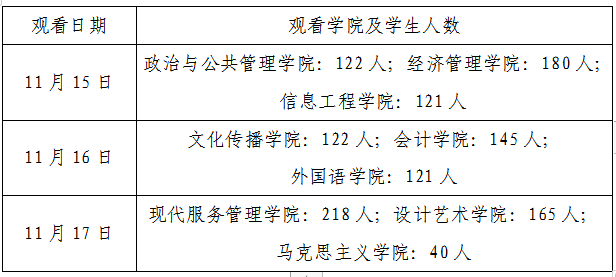 各学院要做好组织动员工作,确保观看活动顺利进行。观看活动以学院为单位(具体学院座区图详见附件),每个学院可由负责老师或学生骨干带队。观看时要服从剧院工作人员的安排,遵守现场秩序,维护环境卫生。为做好疫情防控工作,观看学生务必提前15分钟到场,全程佩戴口罩。各学院观看日期及人数安排见下表,