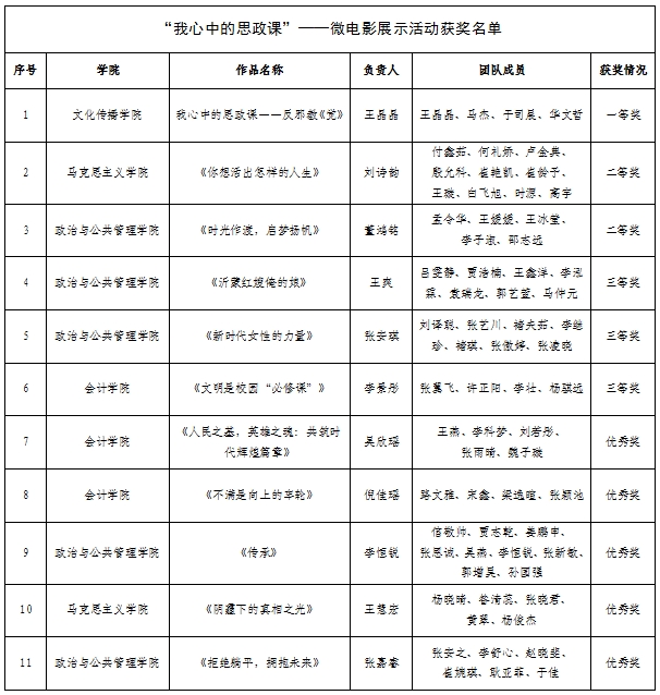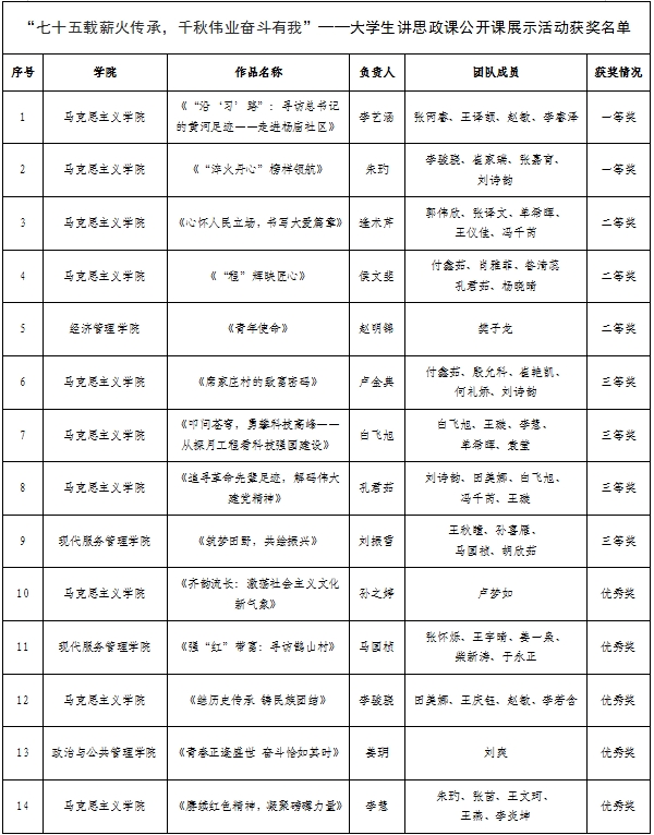 活动一经开展,全校同学踊跃参与,其中“七十五载薪火传承,千秋伟业奋斗有我”——大学生讲思政课公开课展示活动共收到作品20件。经过作品初筛、专家评审等环节,评选出一等奖2项,二等奖3项,三等奖4项,优秀奖5项;“我心中的思政课”——微电影展示活动共收到作品22件,经过作品初筛、专家评审等环节,评选出一等奖1项,二等奖2项,三等奖3项,优秀奖5项。现公示名单如下:
