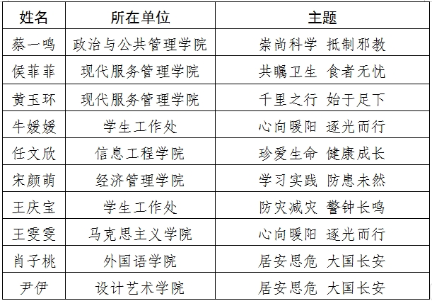 我校辅导员安全教育主题教案课件征集及讲课比赛已圆满结束。比赛面向全体学工人员,共征集教案、课件33份,20位辅导员参加现场讲课比赛。现将评选结果公布如下: