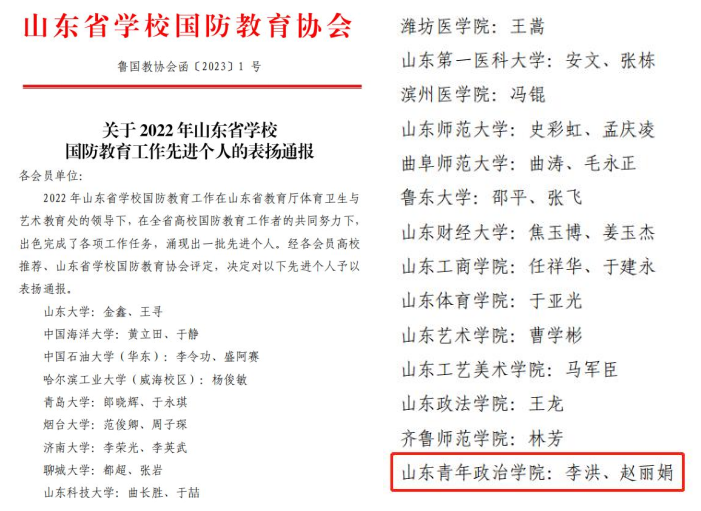 近日,山东省人民政府征兵办公室、山东省教育厅通报全省高校2022年征兵工作完成情况,我校高质量超额完成征兵任务,本科完成率达到144.97%,专科完成率达到126.20%。学生工作部(处)李洪、赵丽娟两位老师获评“2022年山东省学校国防教育工作先进个人”,受到山东省学校国防教育协会通报表扬。