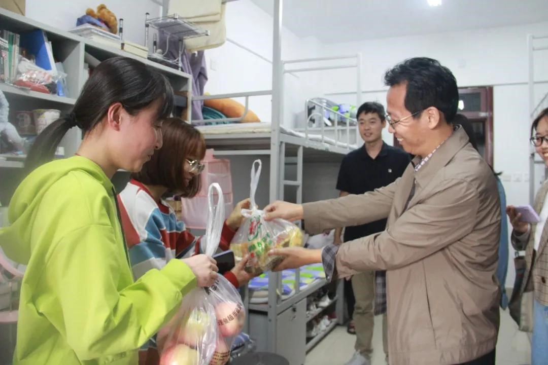 走访过程中,老师们为每位同学送去了月饼和苹果,同时与同学们就学习情况、日常生活、卫生状况、未来规划等方面进行亲切交谈。在与9509宿舍同学们交流中辅导员讲到:同学们都来自五湖四海,能聚到一起很不容易,希望大家能互相帮助,经营好这个小家庭。并且叮嘱同学们天气转凉,要多添衣物,预防流感。