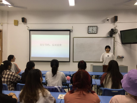 为贯彻落实习近平总书记关于“坚决制止餐饮浪费行为,切实培养节约习惯”的重要指示精神,大力弘扬中华民族勤俭节约传统美德,引导大学生树立勤俭节约意识,外国语学院自9月23日起陆续在2019级各班开展“厉行节约、文明校园”主题班会。