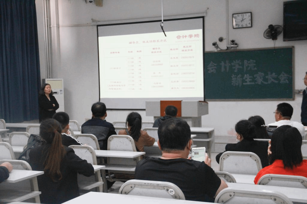 会议伊始,院长白洁和副院长崔伟分别从会计学院的发展历程、办学理念、教学科研、师资力量、学生管理、升学就业和人才培养等方面对学校做了全面介绍,并就家长们最关心的学业之路以及就业前景等问题进行了详细解答。白洁谈到,大学是人生成长的重要阶段,新生教育是大学教育中的重要阶段。家长在关心学生学业发展的同时,也要重视孩子的身心健康,多与辅导员、班主任沟通交流,帮助新生尽快适应并融入大学生活。学院会秉承“明善、思诚、弘志、笃学”的院训,以专业的师资和出色的思政工作团队,为学生的学习和生活保驾护航,陪伴学生共同成长。