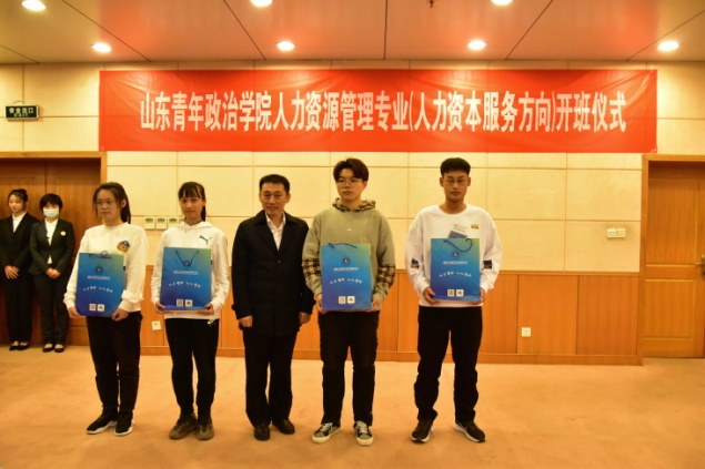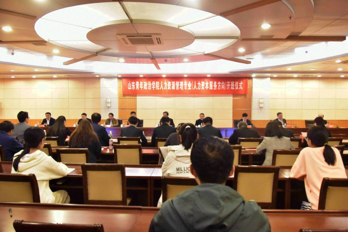 为加速推动人力资本服务业落地,全面构建人力资本产业生态,山东青年政治学院与济南人力资本产业研究院联合开设的全国首个人力资源管理专业(人力资本服务方向)开班仪式在山东青年政治学院学术会议厅举行。中国人力资源开发研究会副会长杨河清,山东省人力资源和社会保障厅人力资源流动管理处处长刘保俭,共青团济南市委党组书记、市青联主席黄晓广,济南市教育局总督学成刚,济南市教育局高校联络服务处处长王志国,济南综合保税区管委会常务副主任、党工委副书记兼高新区管委会副主任、党工委委员张维国,济南人力资本产业研究院执行副院长王安中,济南人力资本产业研究院副院长韩俊杰,山东青年政治学院党委书记鹿林、副院长等出席开班仪式。开班式由山东青年政治学院党委副书记高峰主持。