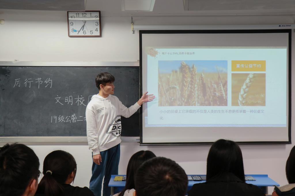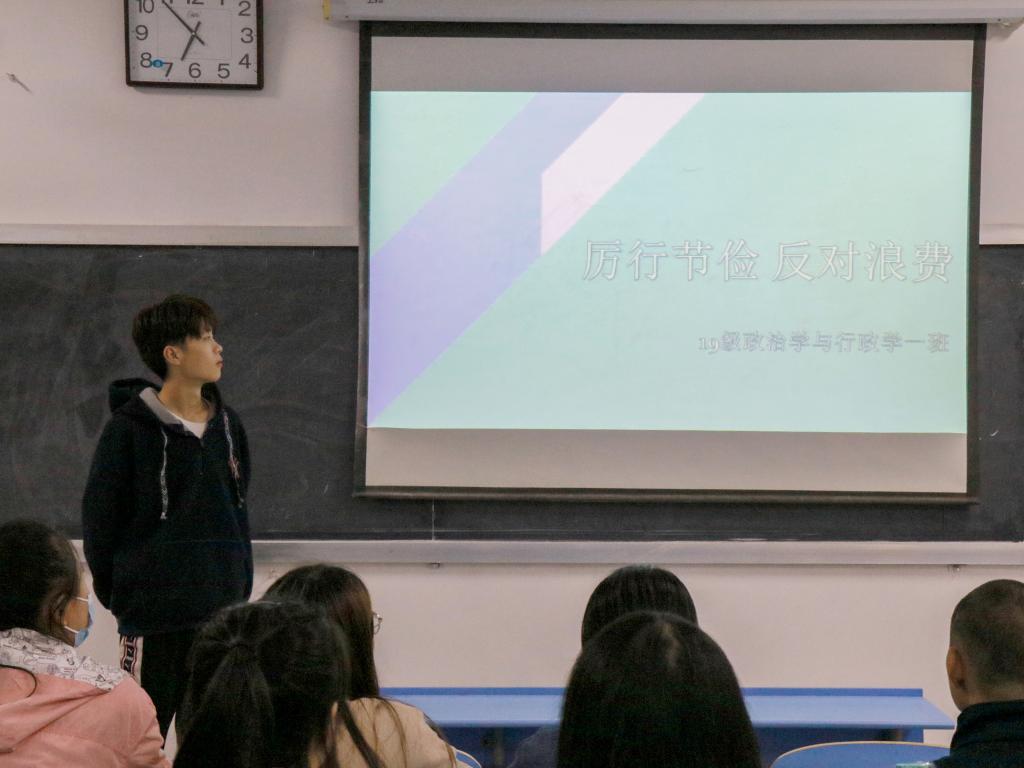 主题班会中,各班结合社会现象和具体事例,通过PPT讲解、观看公益片、游戏互动、倡议书宣读等多种形式,引导同学们认识节约的重要意义,积极响应国家的号召,从珍惜一粒米、一滴水、一度电、一张纸等小事做起,养成勤俭节约的良好习惯,由己及人带动身边的人厉行节约,杜绝浪费。讨论环节中许多同学就“身边浪费现象”发表了自己的看法,针对剩饭剩菜、不断水电等在校园、宿舍常见的浪费现象作出深刻反思,表达从我做起、厉行节约的决心。班会结束后2019级政治学与行政学专业的姜昱同学谈到:“我觉得厉行节约、杜绝浪费是我们每个人都应该做到的事,大家应该严格树立起勤俭节约光荣、铺张浪费可耻的观念,自觉抵制浪费。”