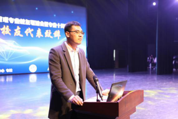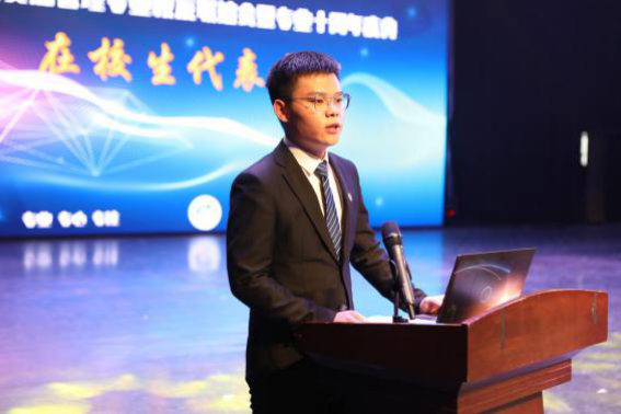 随后,2010级人力资源管理专业校友赵辉上台致辞,表达了对学校、专业老师的衷心感谢,并带来了来自全国各地未能到现场参会校友代表的祝福视频。在校生代表江磊代表全体在校生向莅临本次庆典的各位领导、老师、师哥师姐们表示热烈的欢迎,并表示作为在校生将会以此为榜样,继续传承专业精神。