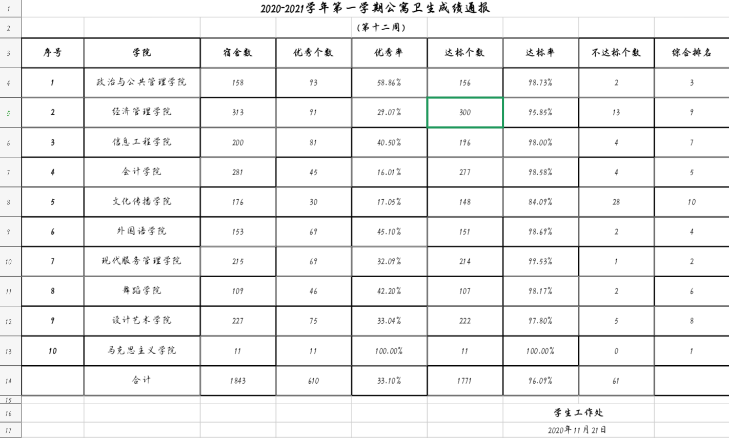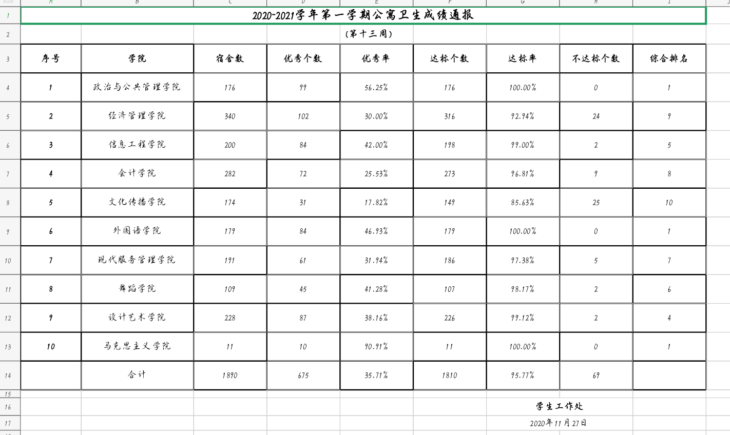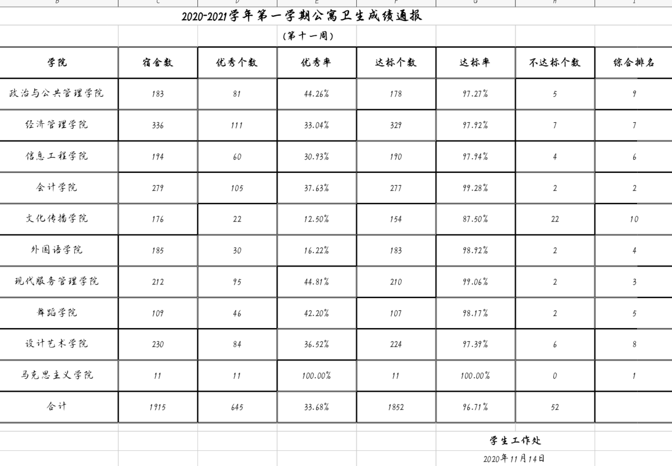会上,李岳松介绍了首次宿舍卫生整改提升专题会召开后,学院宿舍卫生成绩在近三周的变化情况。通过公寓管理中心每周公布的成绩通报可以看出,学院卫生成绩得到明显提升,“不合格宿舍”数量逐渐减少,“优秀个数”稳步提升,通过宿舍卫生整改,学院宿舍卫生整体向好发展。